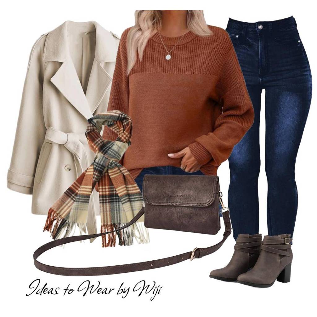 Pair it with navy stretch jeans to create a sleek silhouette that balances the sweater’s volume. The rich denim complements the caramel tones of the knit, giving your outfit a harmonious autumn feel.