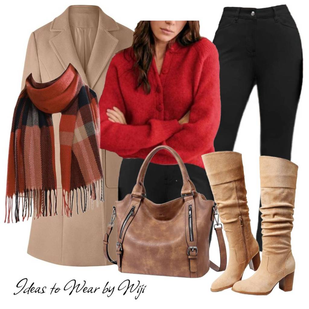 Cold weather doesn’t mean you have to sacrifice style for warmth. This beautifully layered combination blends bold seasonal color with soft neutrals to create a warm, polished winter look that’s both comfortable and effortlessly chic.